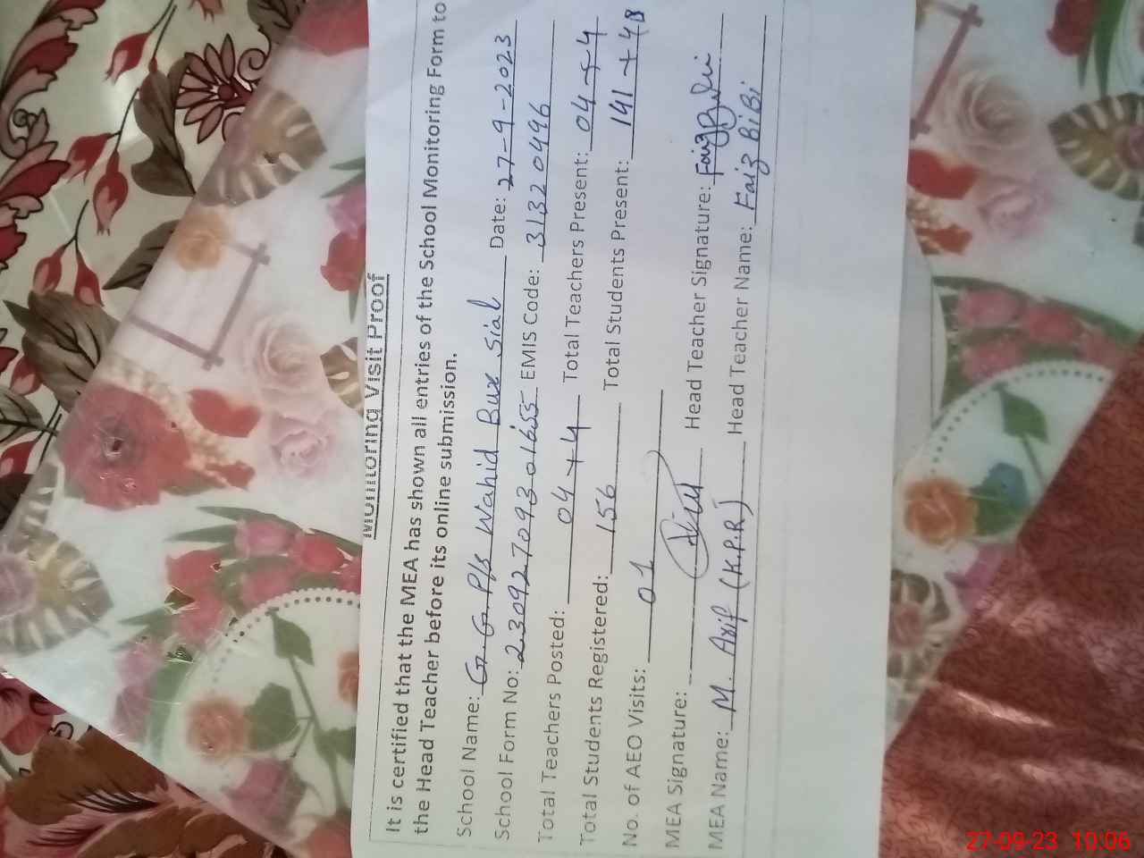 | Attendance Register | Head Teacher | MEA with School | Visit Proof |