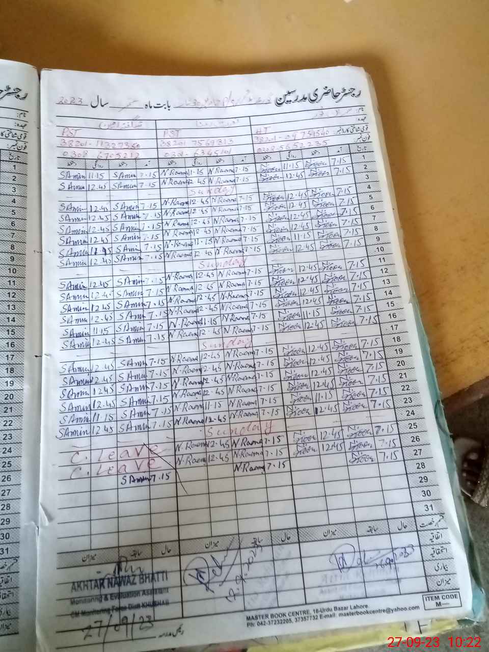 | CNIC | Full Name | Designation | R/C | Absence During Last Calender Month |