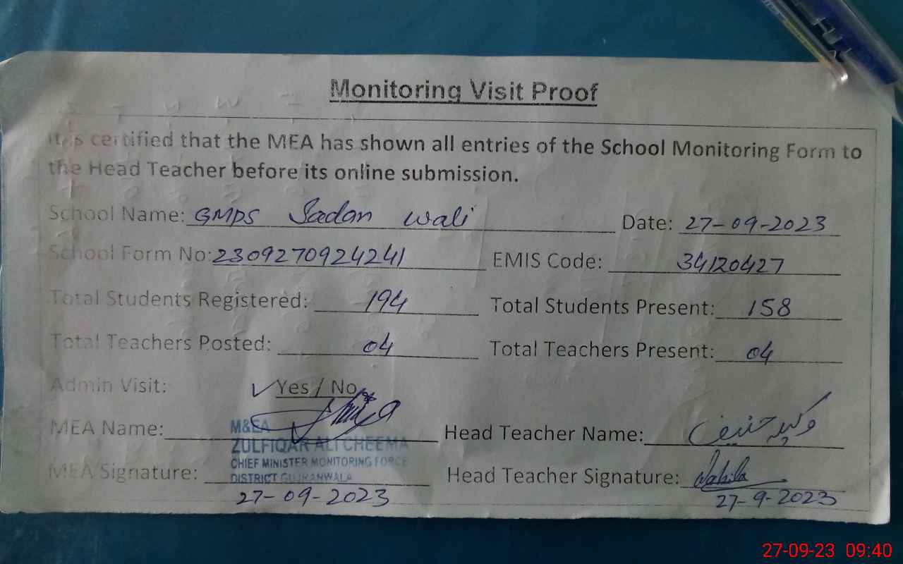 | EMIS Code: 34120427 | Name of School: GMPS SADAN WALI | |||