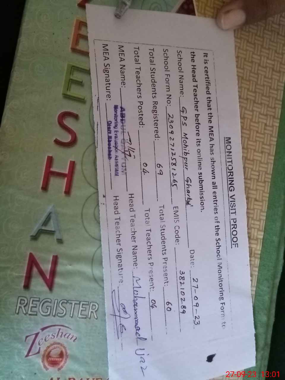 | Attendance Register | Head Teacher | MEA with School | Visit Proof |