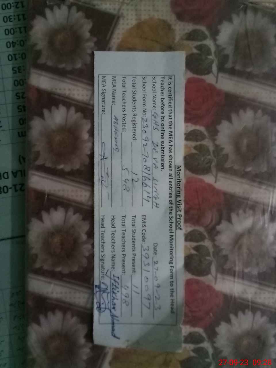 | Attendance Register | Head Teacher | MEA with School | Visit Proof |