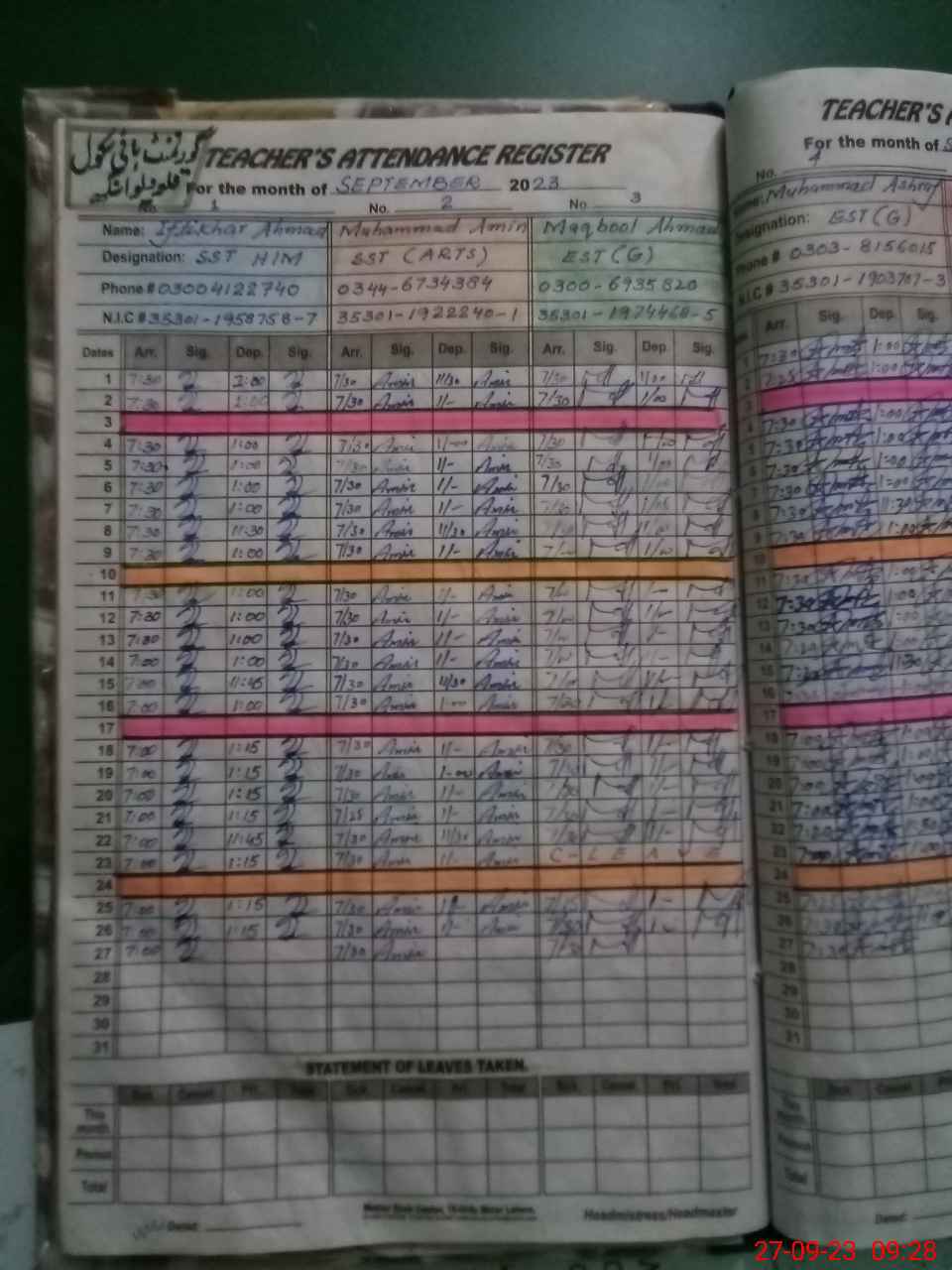 | Name: IF**** AH**** Designation: (School Headmaster's/Headmistress's) SST INCHARGE HM Phone/Cell Number: 03**** |