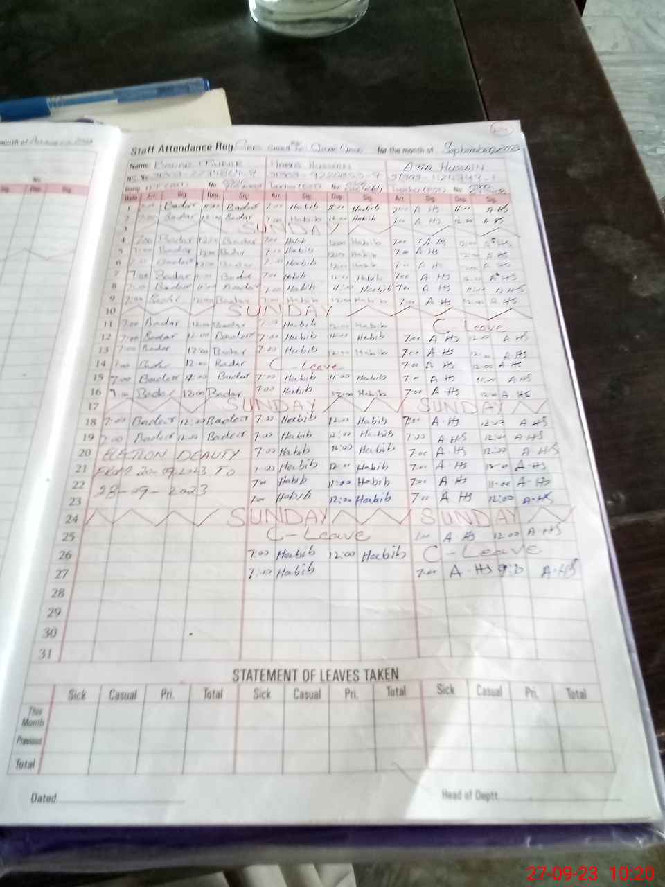| CNIC | Full Name | Designation | R/C | Absence During Last Calender Month |