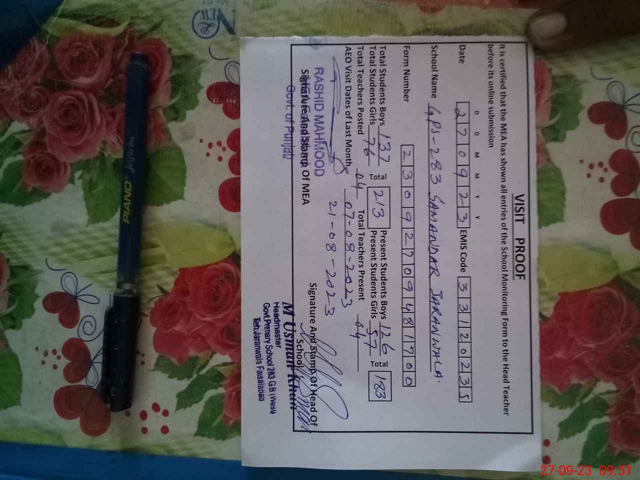 | Attendance Register | Head Teacher | MEA with School | Visit Proof |