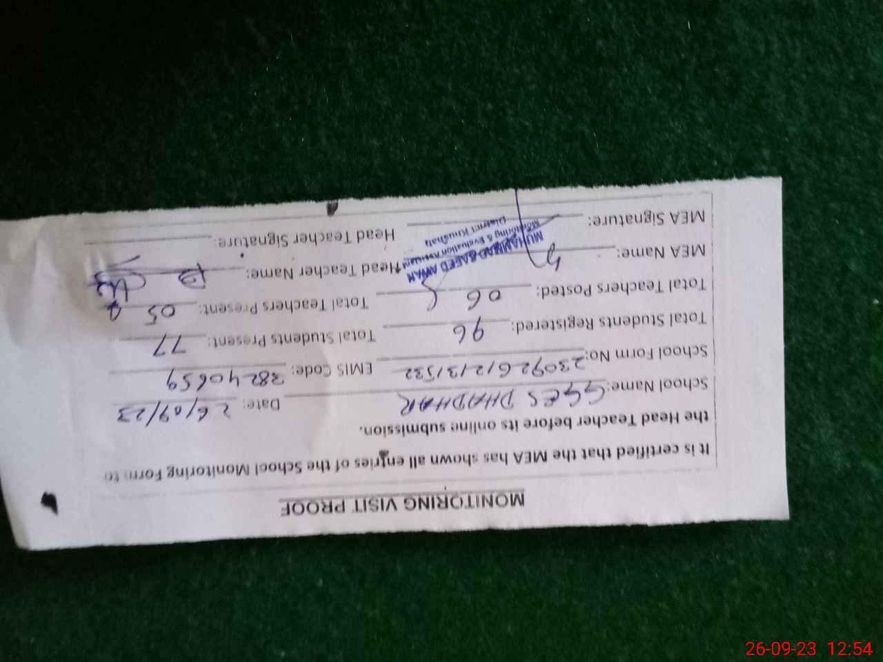 | Attendance Register | Head Teacher | MEA with School | Visit Proof |
