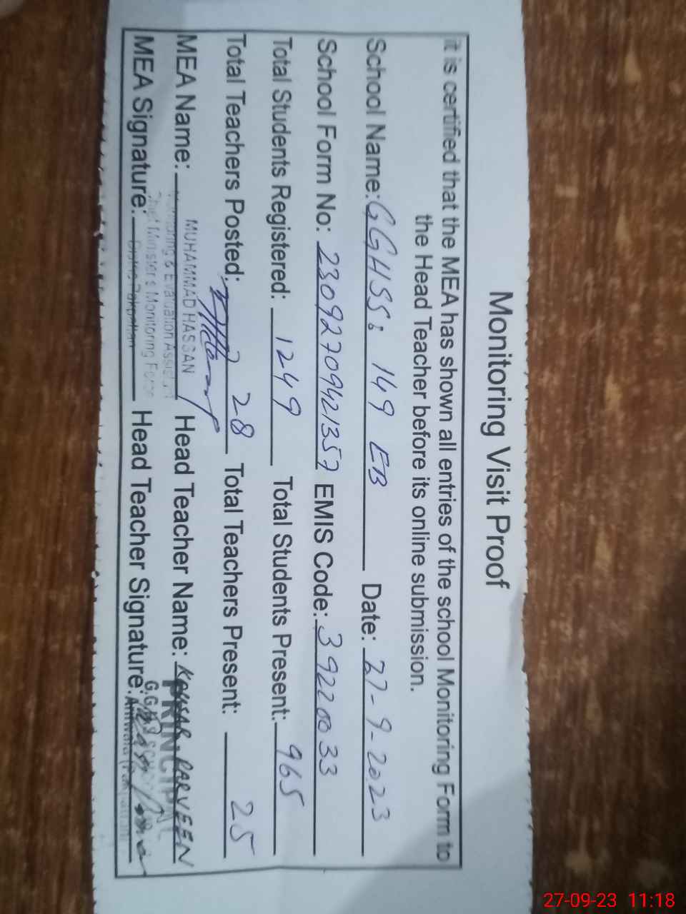 | Attendance Register | Head Teacher | MEA with School | Visit Proof |