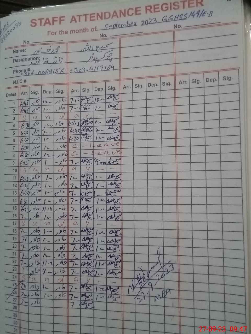 | CNIC | Full Name | Designation | R/C | Absence During Last Calender Month |