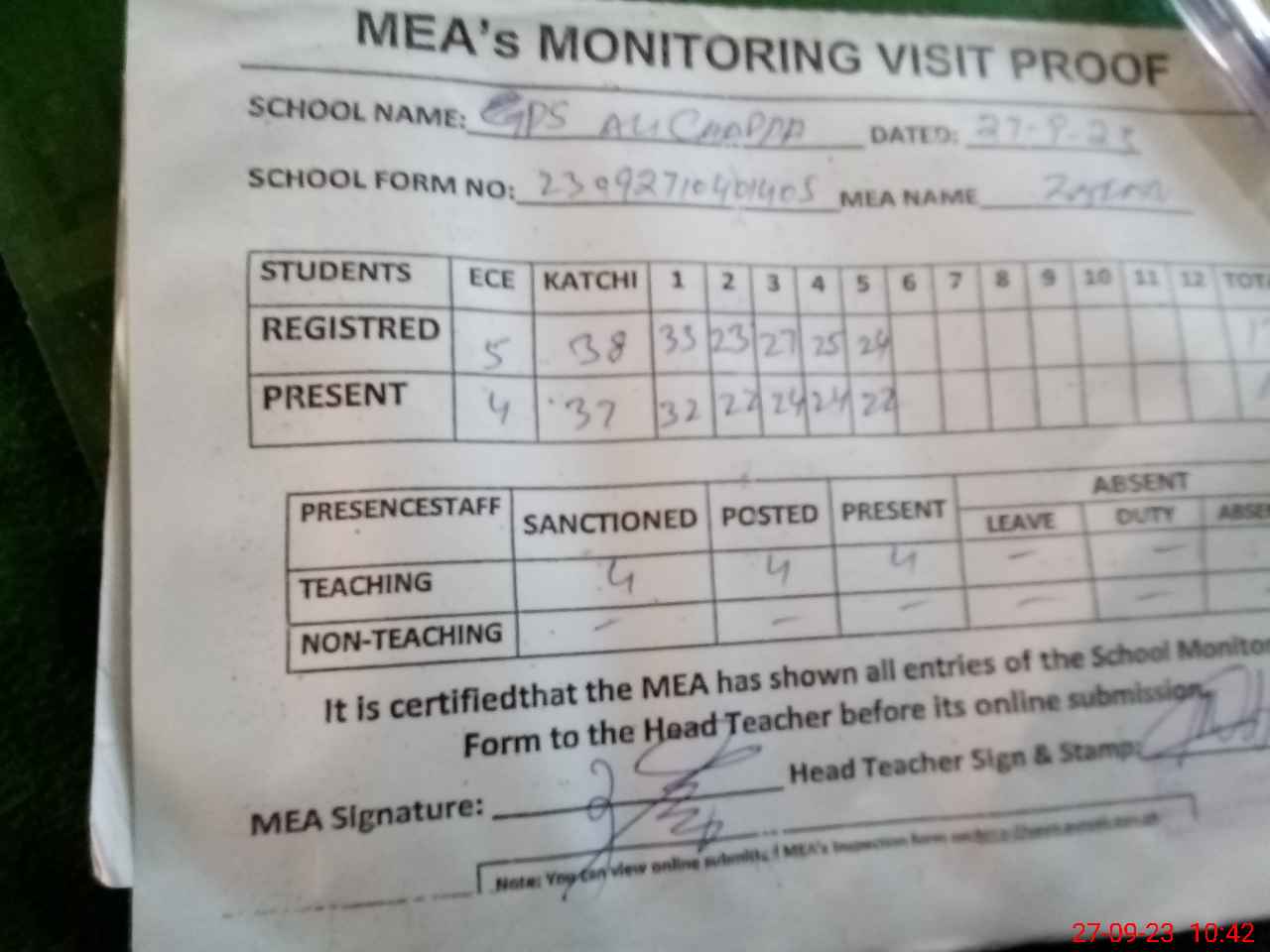 | Attendance Register | Head Teacher | MEA with School | Visit Proof |
