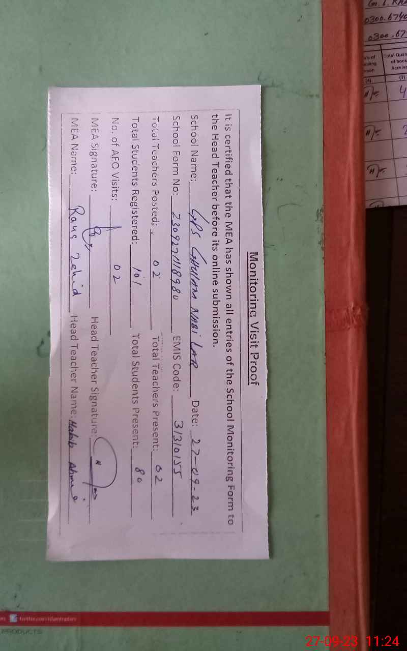 | Attendance Register | Head Teacher | MEA with School | Visit Proof |