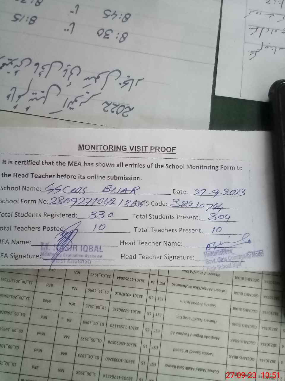 | Attendance Register | Head Teacher | MEA with School | Visit Proof |