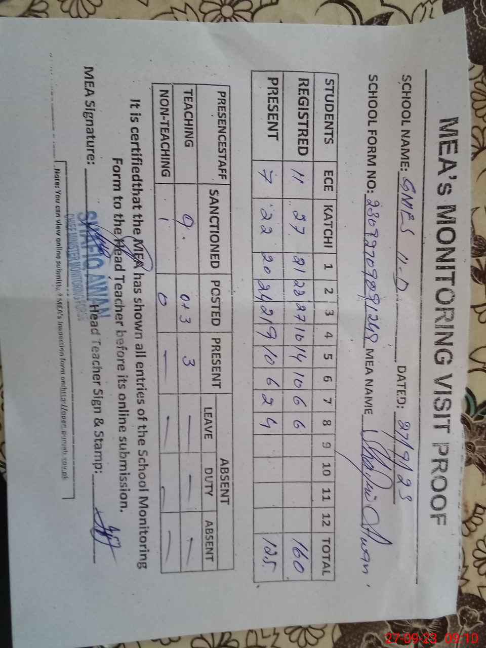 | Attendance Register | Head Teacher | MEA with School | Visit Proof |