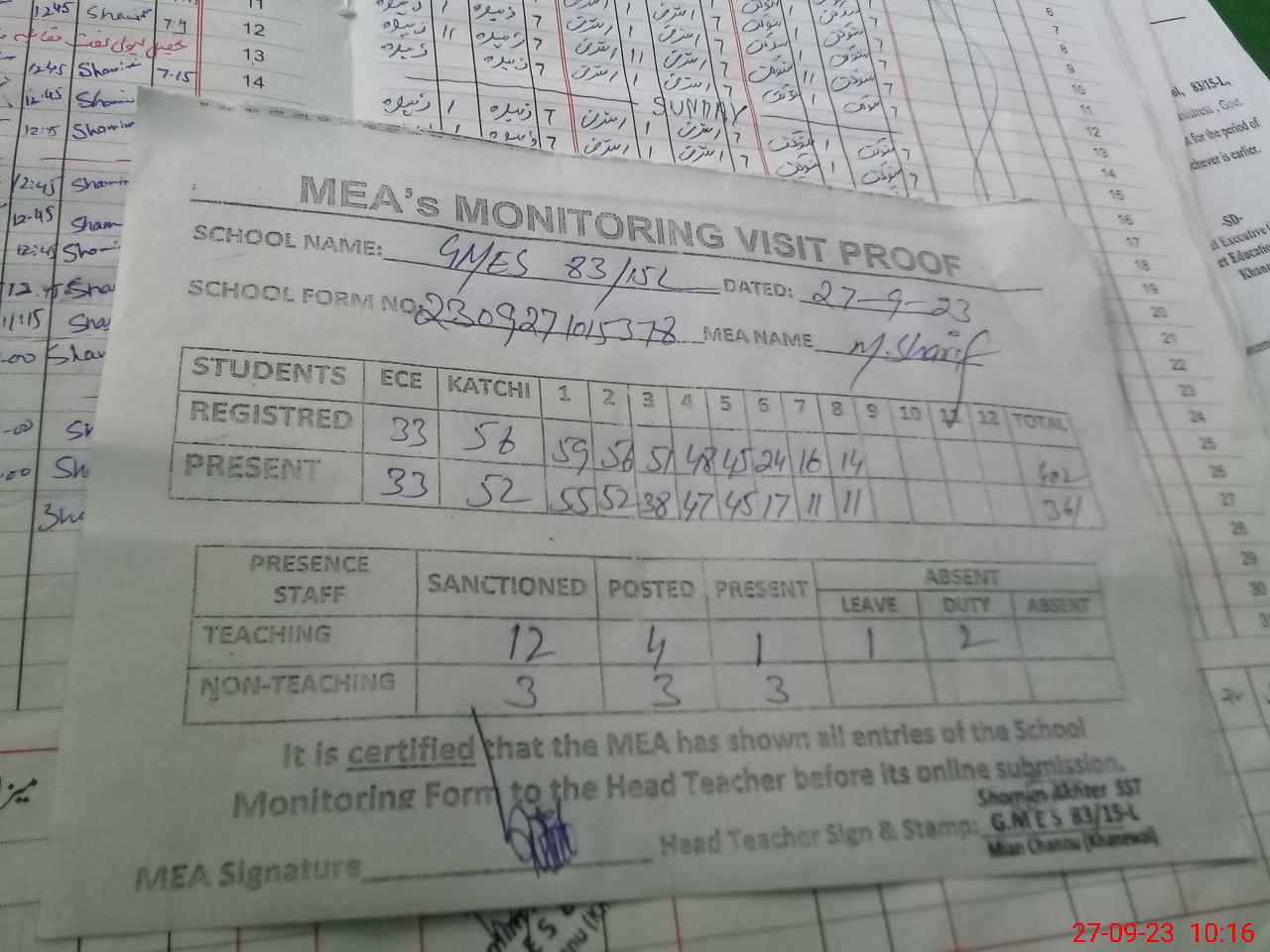 | Attendance Register | Head Teacher | MEA with School | Visit Proof |