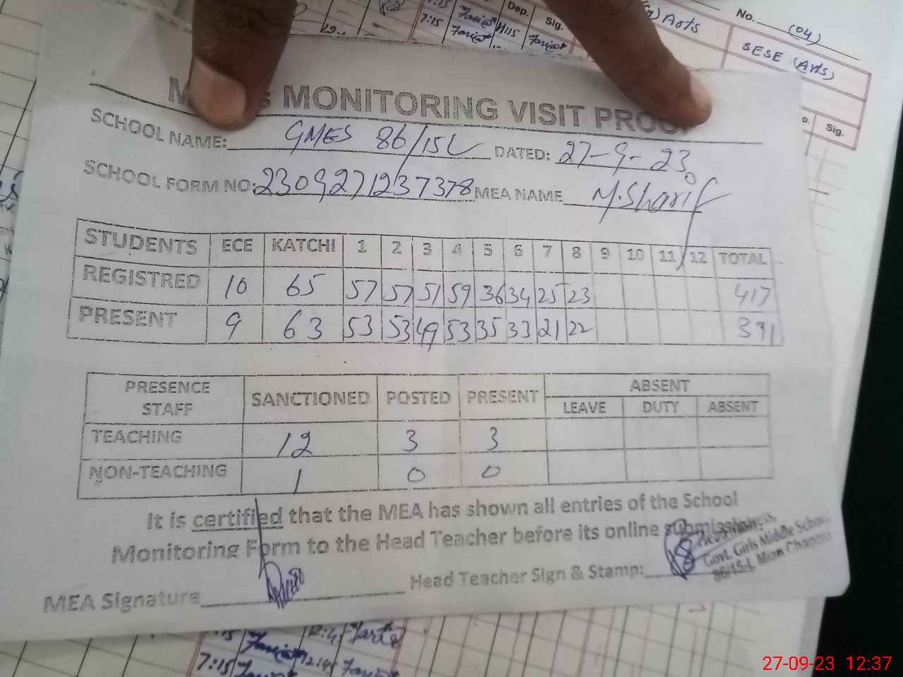 | Attendance Register | Head Teacher | MEA with School | Visit Proof |