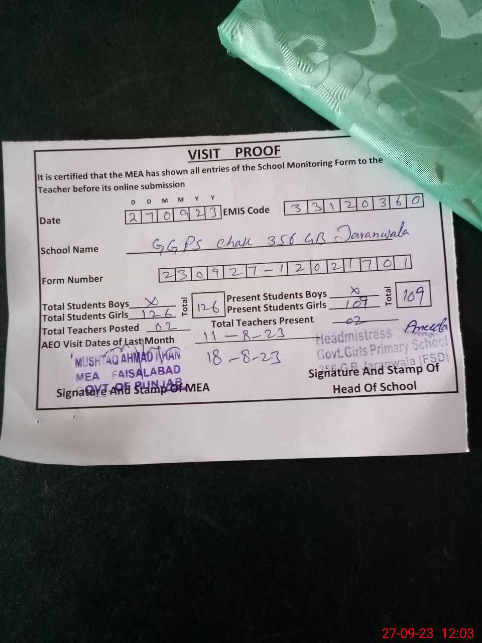 | Attendance Register | Head Teacher | MEA with School | Visit Proof |