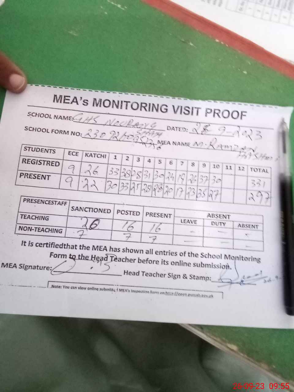 | Attendance Register | Head Teacher | MEA with School | Visit Proof |
