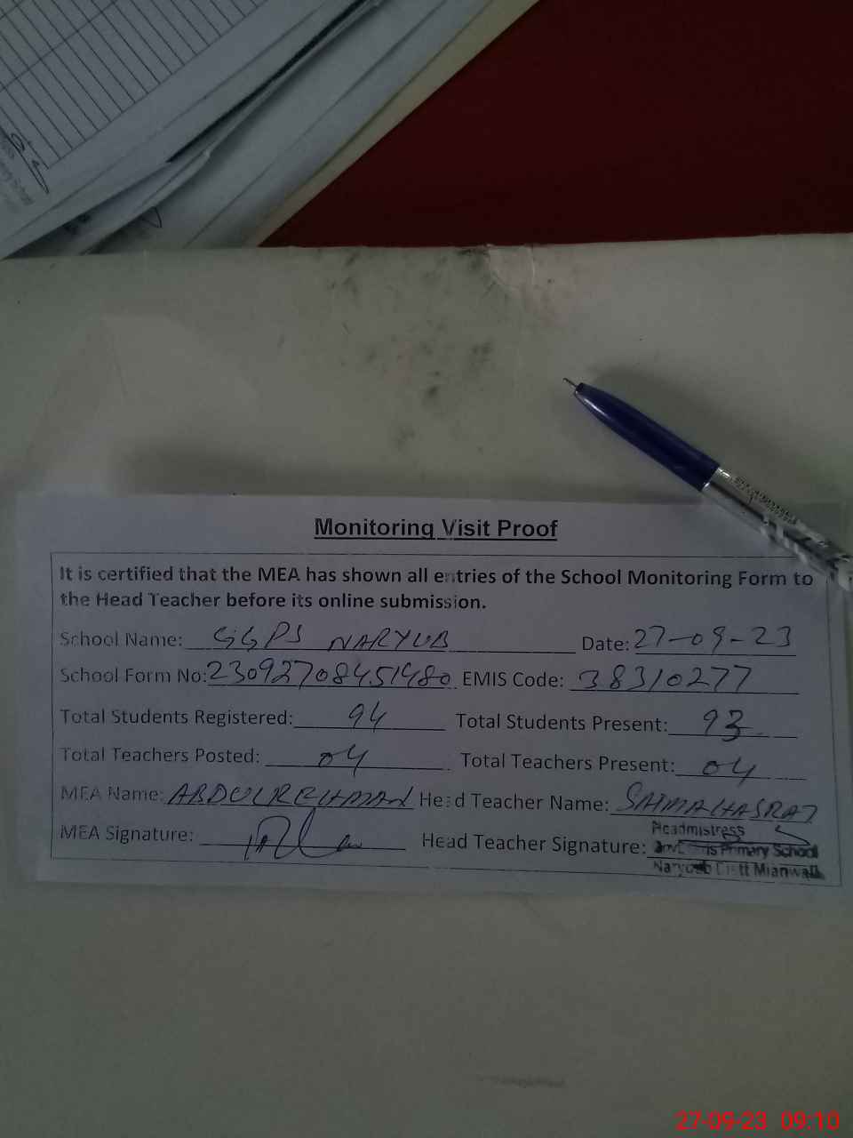 | Attendance Register | Head Teacher | MEA with School | Visit Proof |