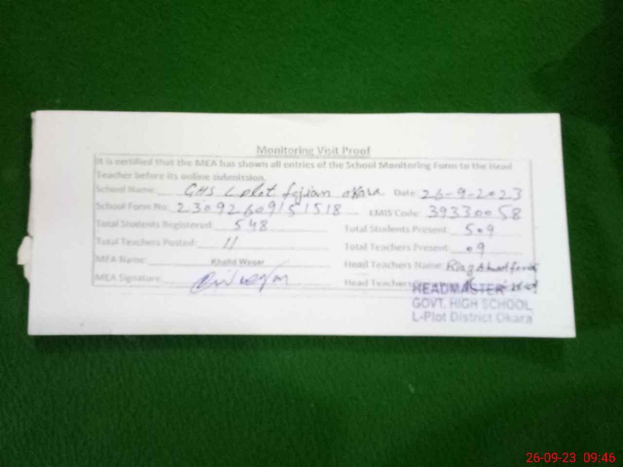 | Certified that this School was Inspected by the Undersigned MEA/DMO Today and the Information Stated Above is as Per Record. | |||||