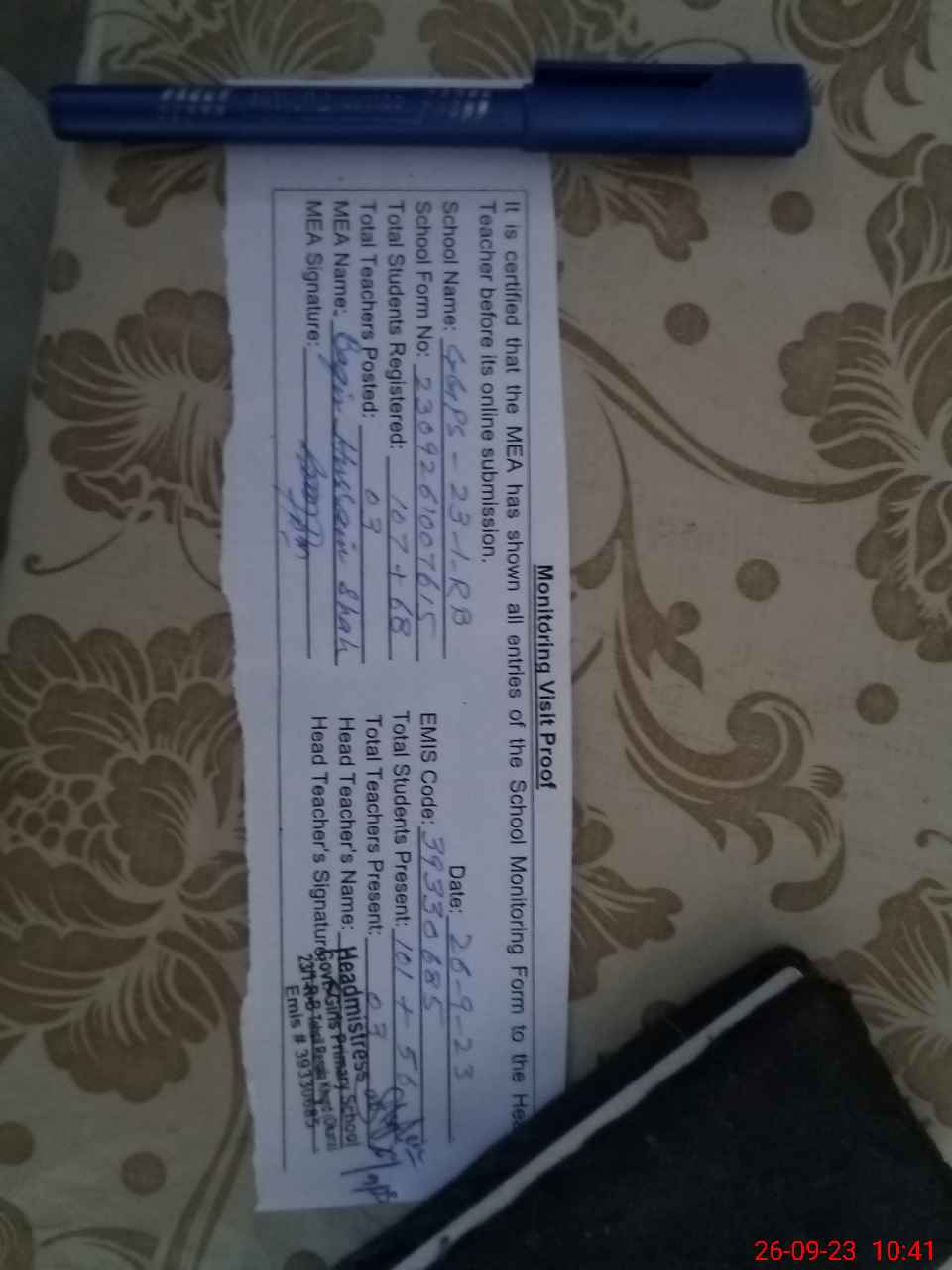 | Attendance Register | Head Teacher | MEA with School | Visit Proof |