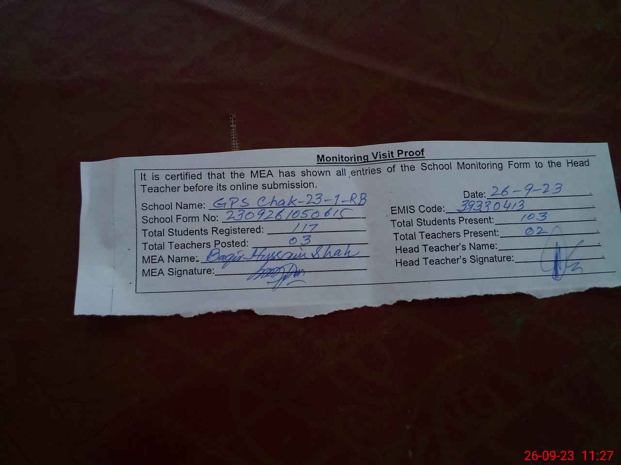| EMIS Code: 39330413 | Name of School: GPS CHAK NO. 23/1-RB | |||