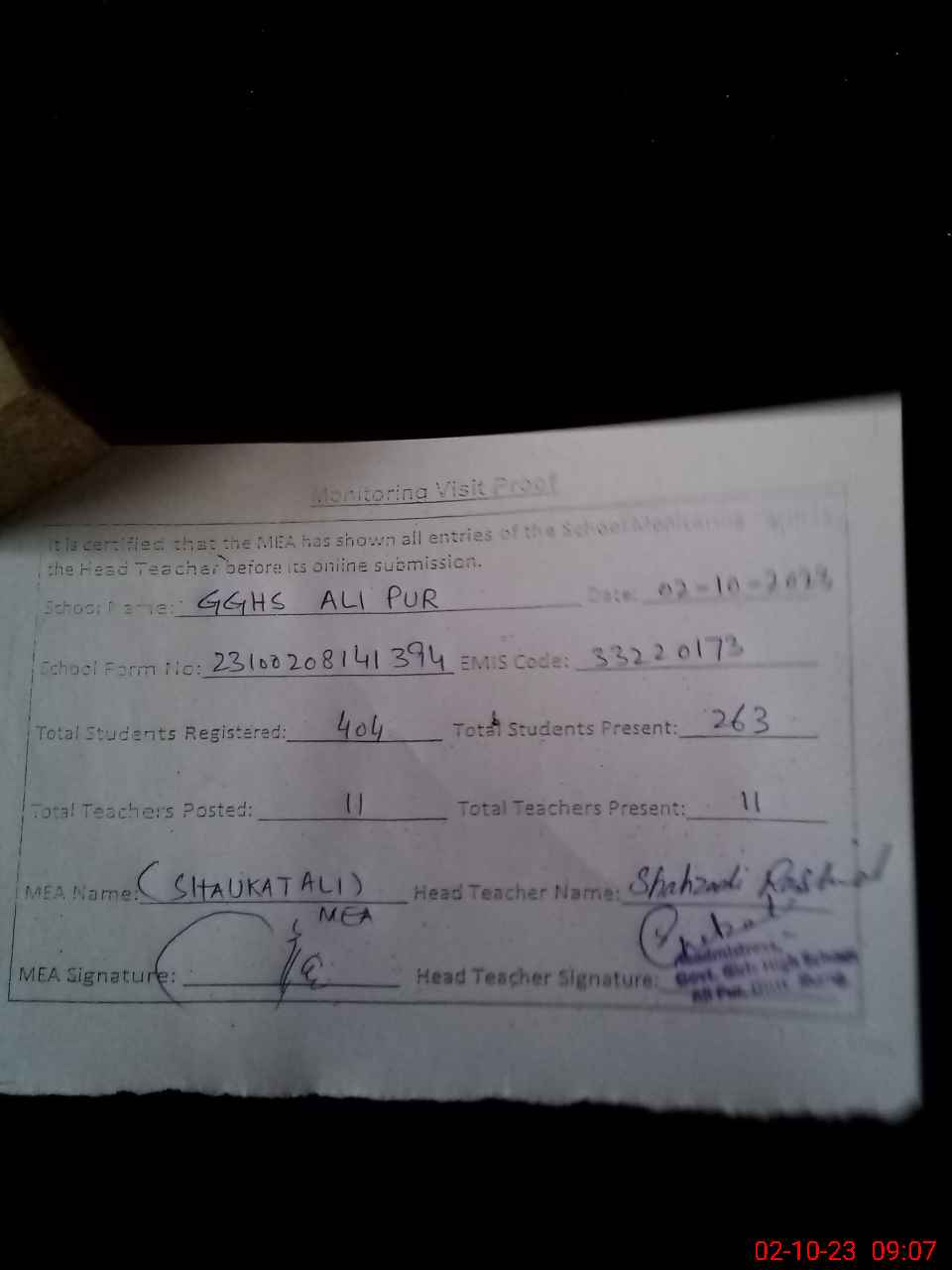 | Attendance Register | Head Teacher | MEA with School | Visit Proof |