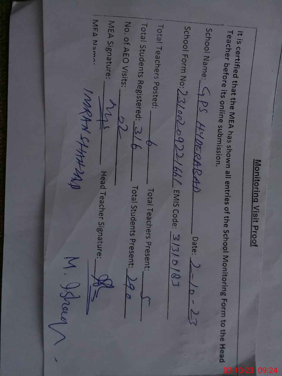 | Attendance Register | Head Teacher | MEA with School | Visit Proof |