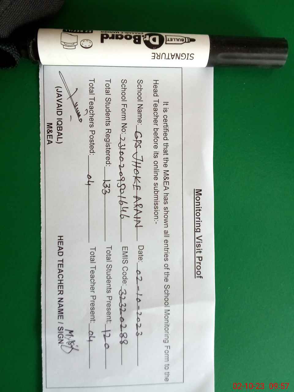 | Attendance Register | Head Teacher | MEA with School | Visit Proof |