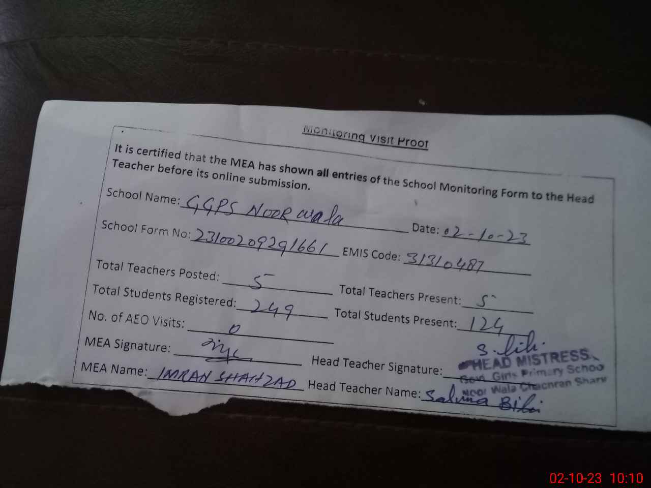 | Monitoring Date: 02-10-2023 | Start Time: 02-10-2023 09:31 AM | End Time: 02-10-2023 10:16 AM | Name of MEA: Im**** Sh**** | |