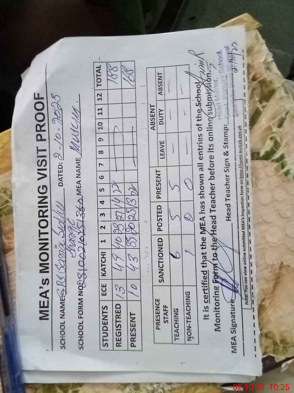 | Attendance Register | Head Teacher | MEA with School | Visit Proof |