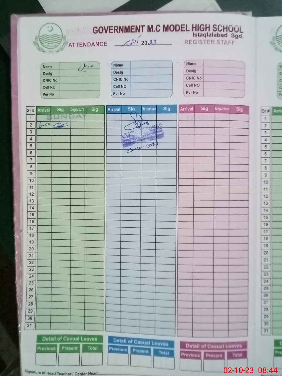 | CNIC | Full Name | Designation | R/C | Absence During Last Calender Month |