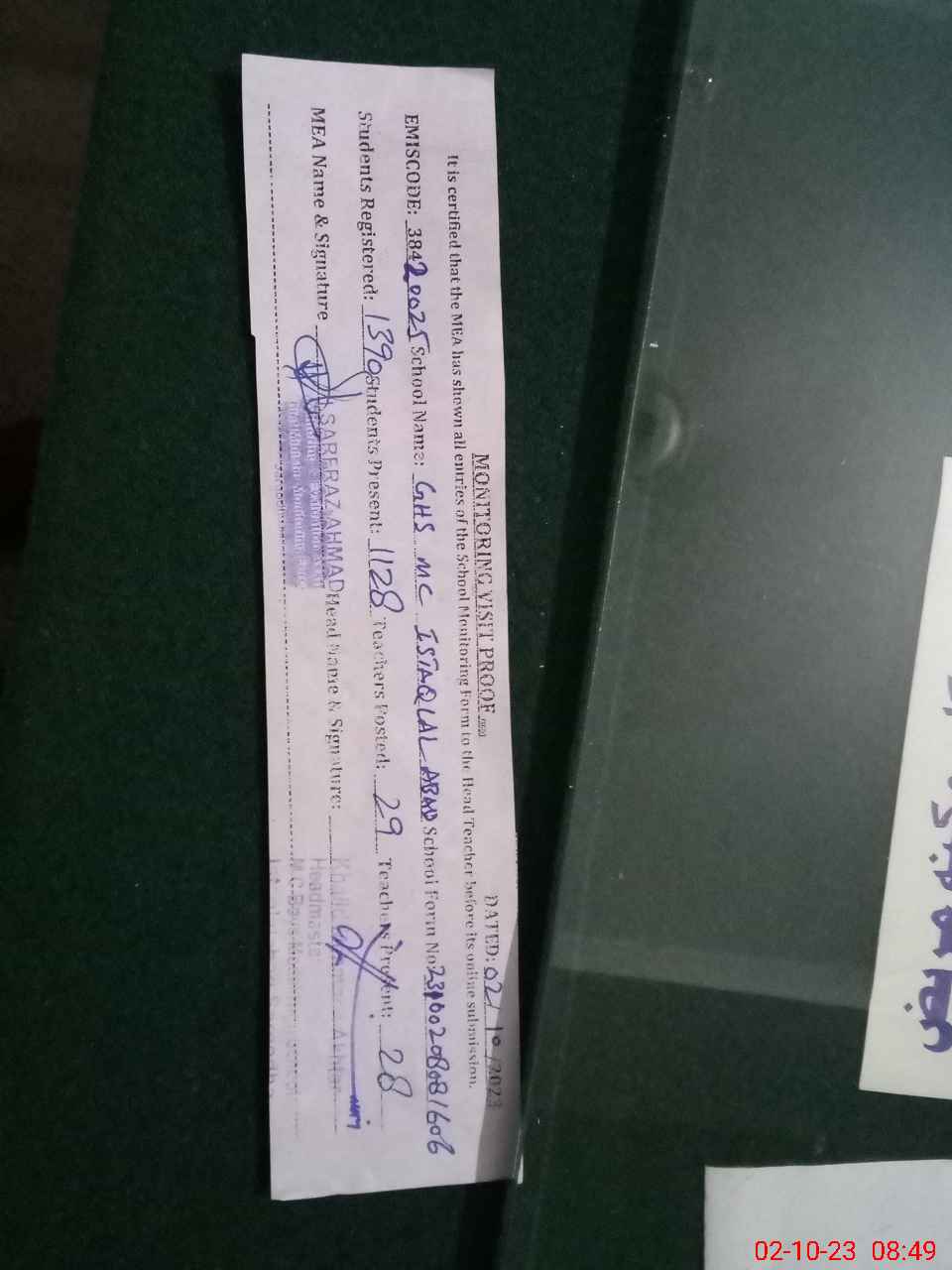 | Certified that this School was Inspected by the Undersigned MEA/DMO Today and the Information Stated Above is as Per Record. | |||||