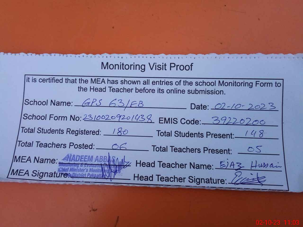 | Attendance Register | Head Teacher | MEA with School | Visit Proof |