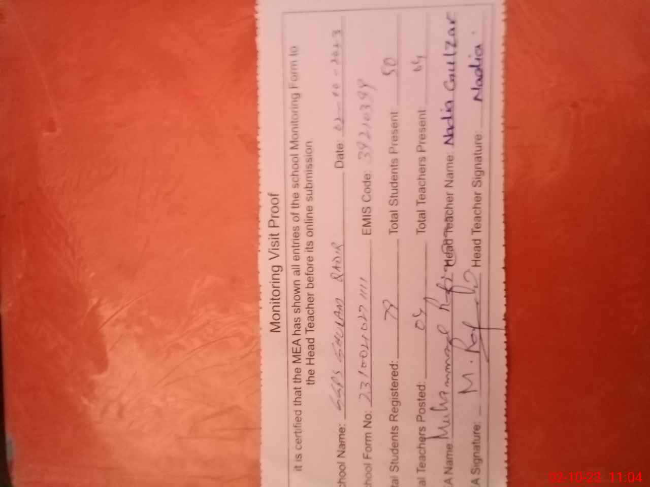 | Attendance Register | Head Teacher | MEA with School | Visit Proof |