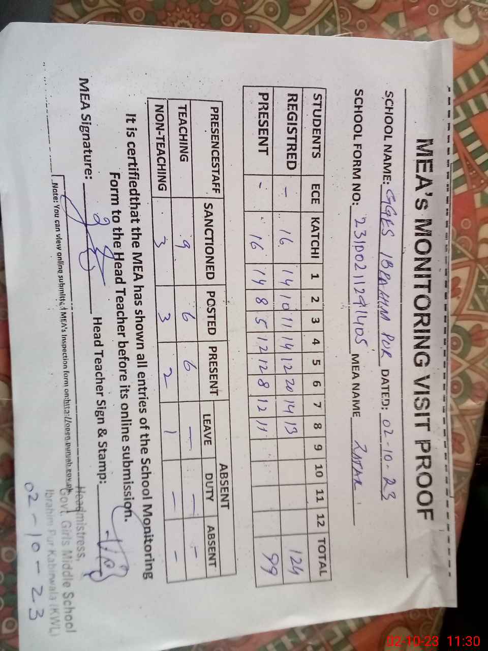 | Attendance Register | Head Teacher | MEA with School | Visit Proof |