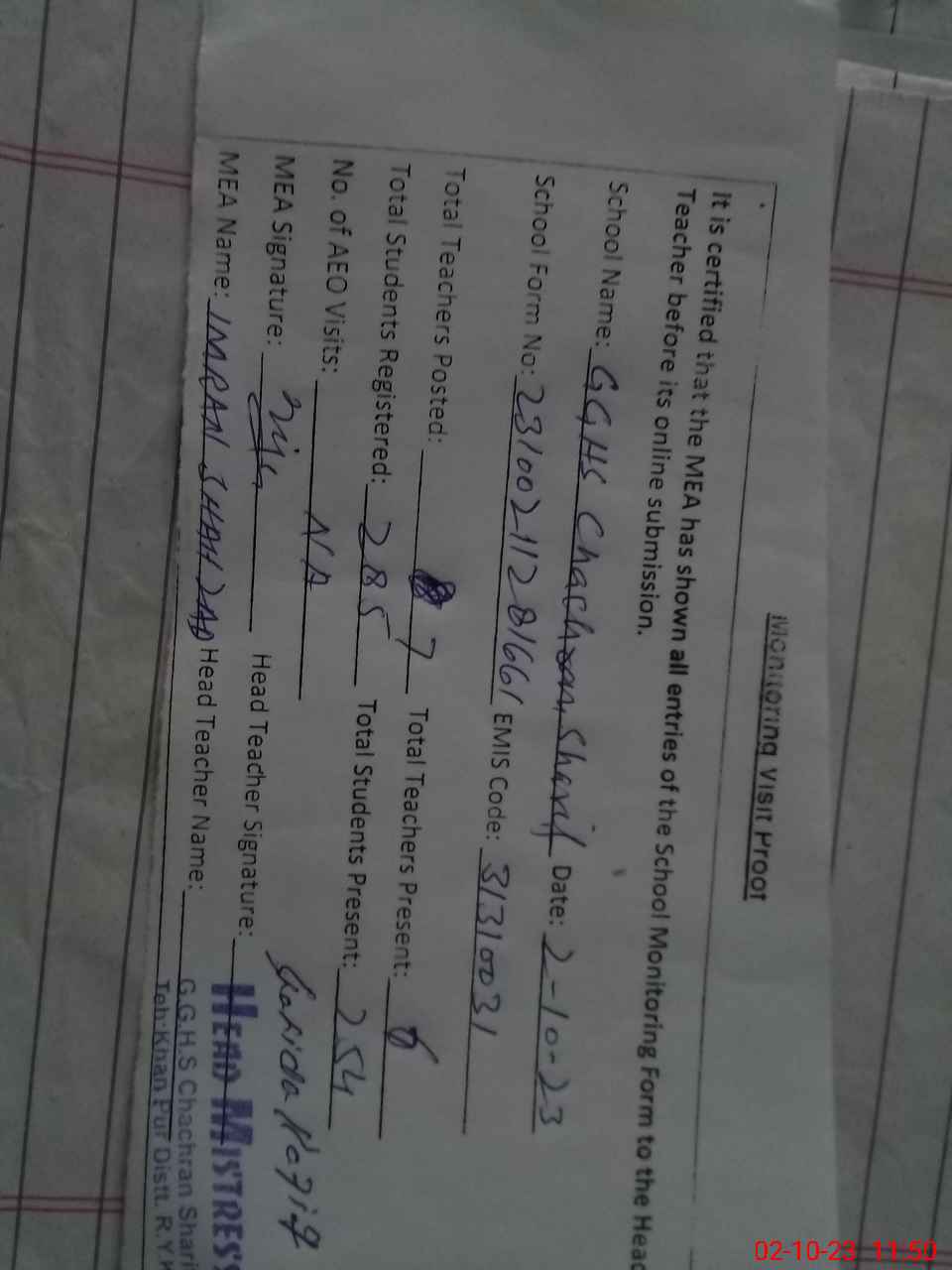 | Attendance Register | Head Teacher | MEA with School | Visit Proof |