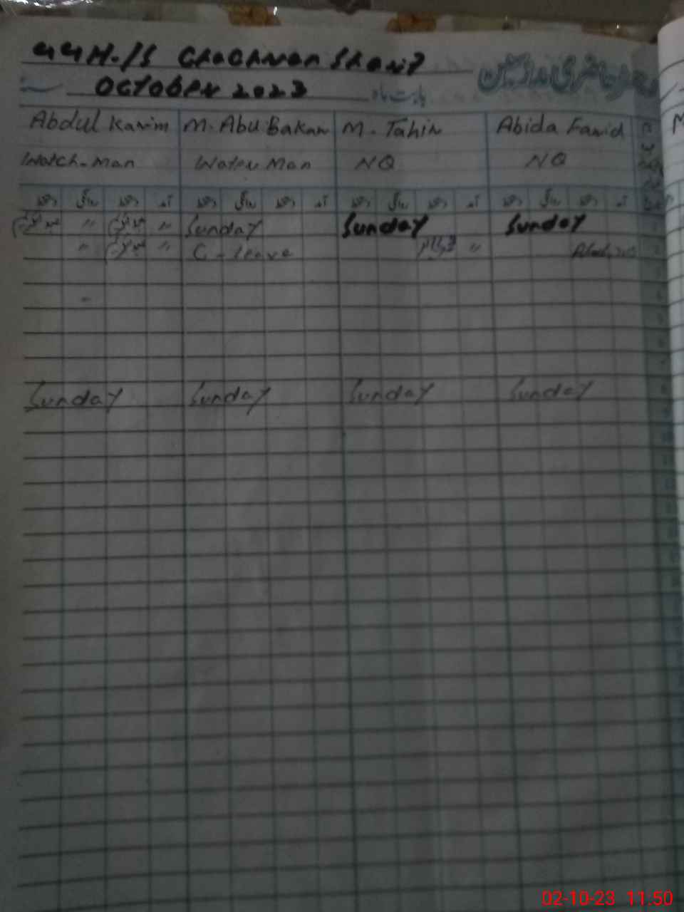 | CNIC | Full Name | Designation | R/C | Absence During Last Calender Month |