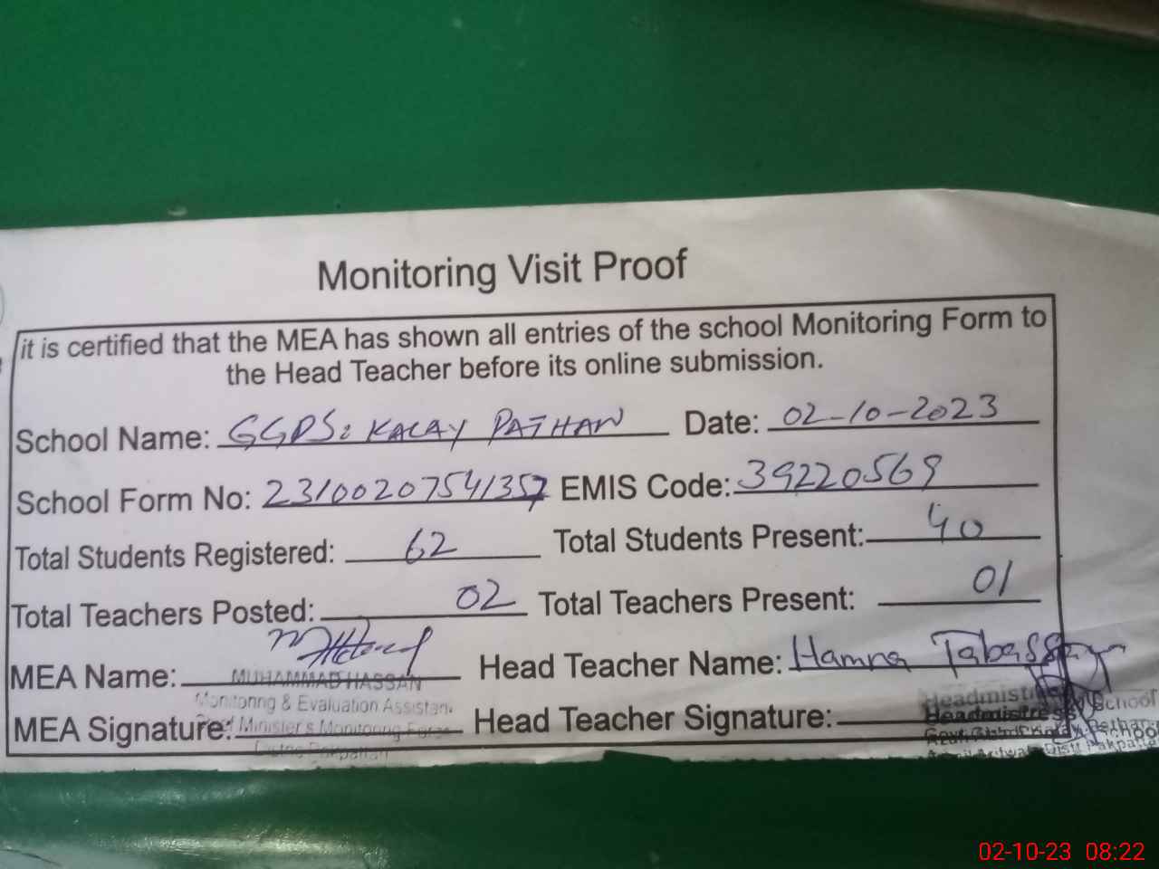 | Certified that this School was Inspected by the Undersigned MEA/DMO Today and the Information Stated Above is as Per Record. | |||||