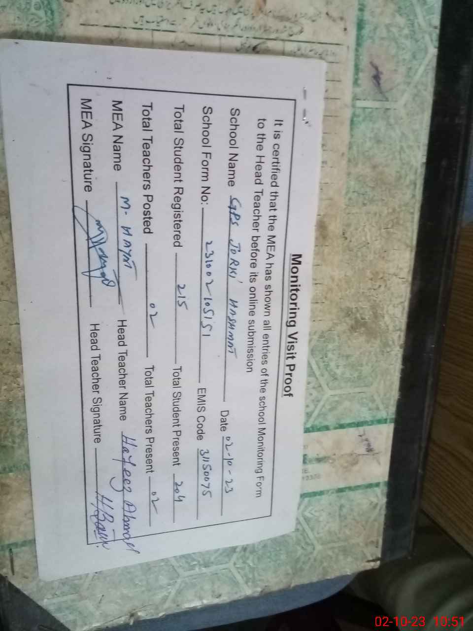 | Certified that this School was Inspected by the Undersigned MEA/DMO Today and the Information Stated Above is as Per Record. | |||||