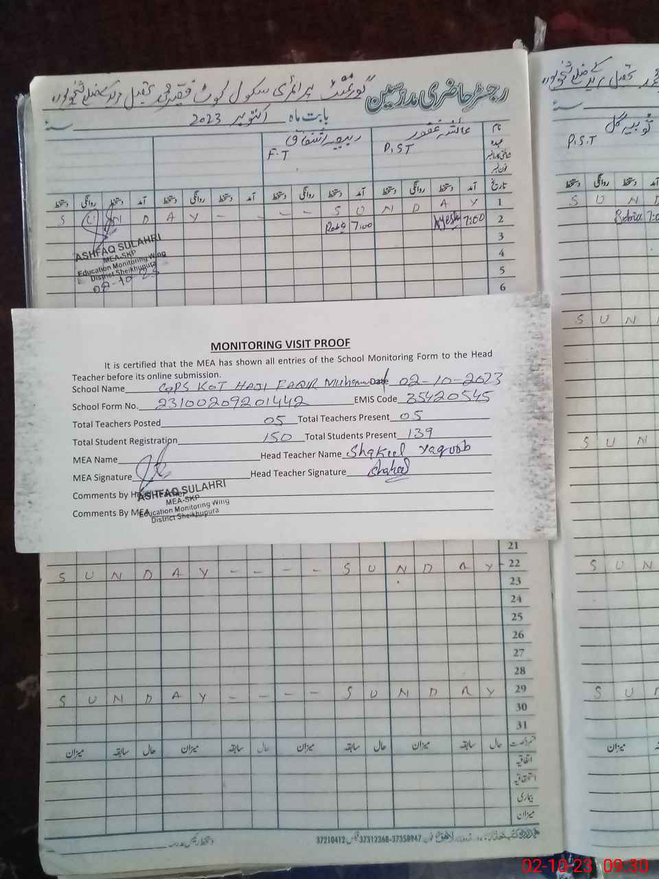 | Attendance Register | Head Teacher | MEA with School | Visit Proof |