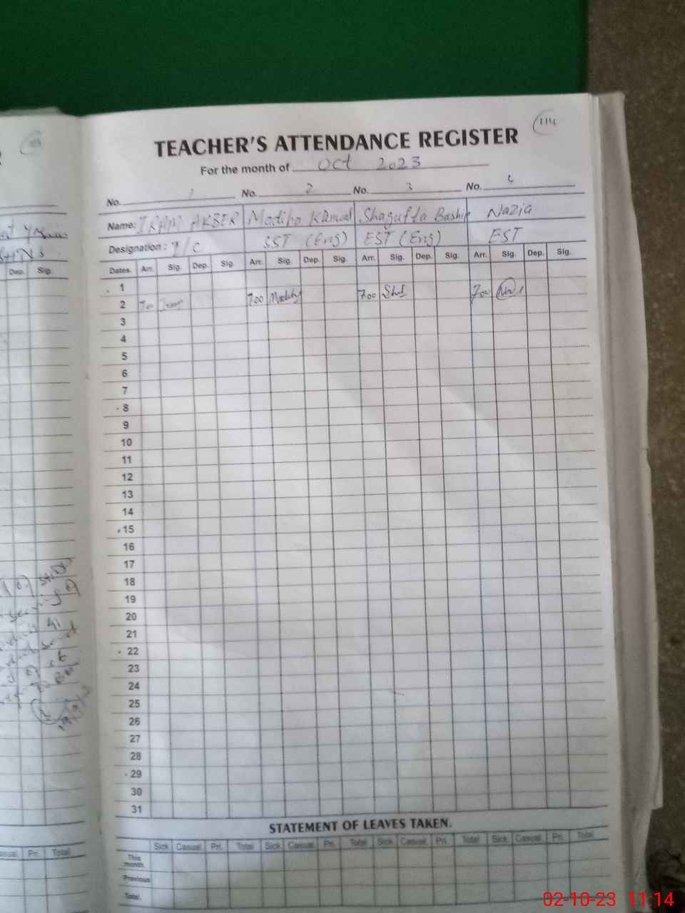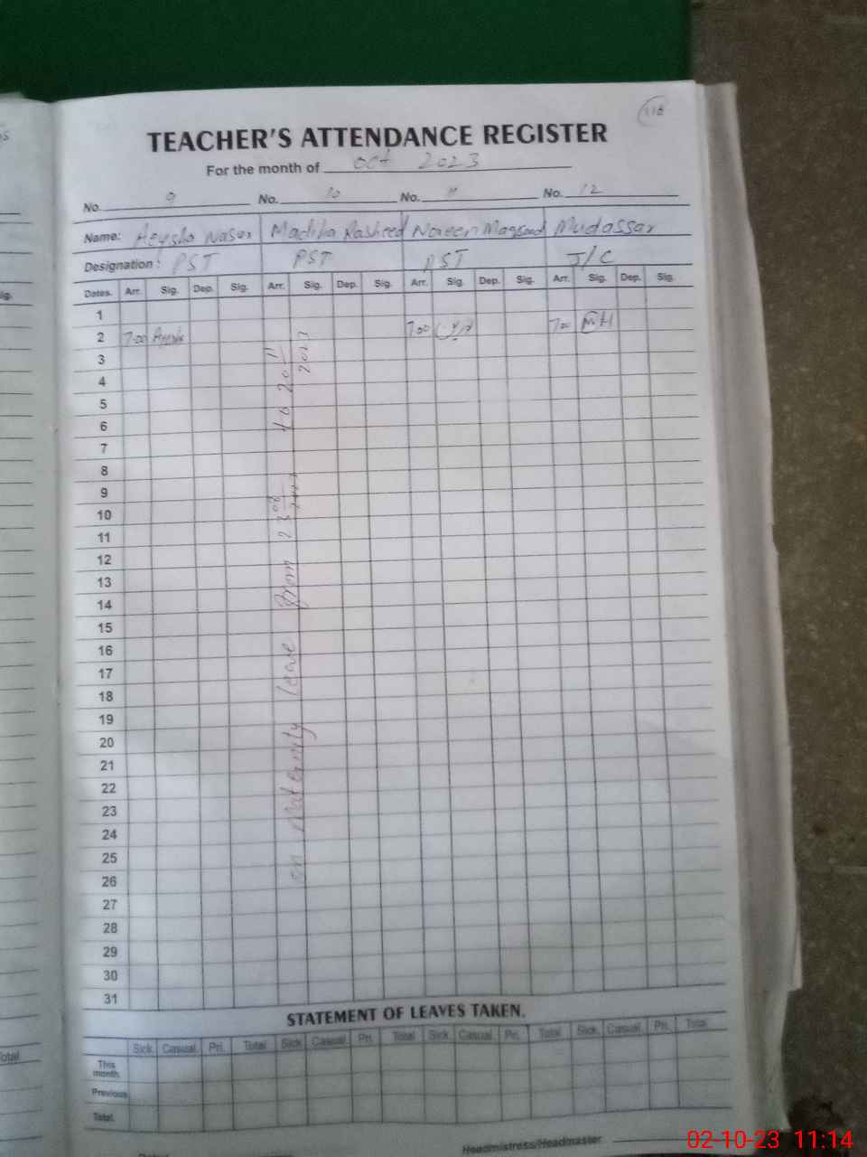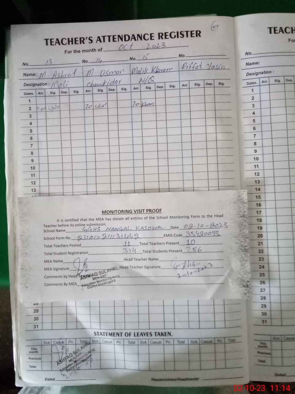 | Attendance Register | Head Teacher | MEA with School | Visit Proof |