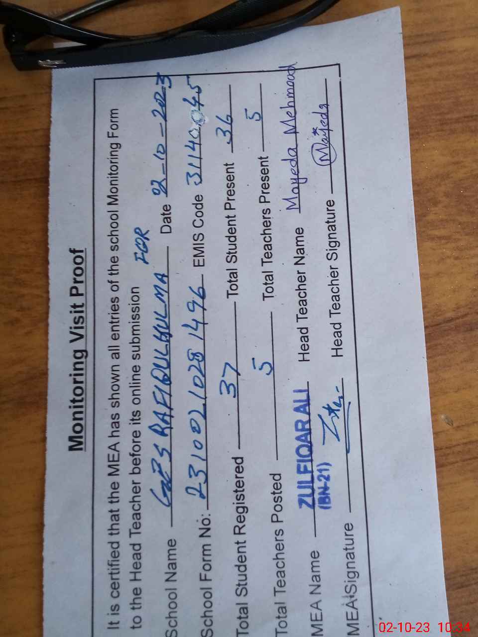 | Certified that this School was Inspected by the Undersigned MEA/DMO Today and the Information Stated Above is as Per Record. | |||||