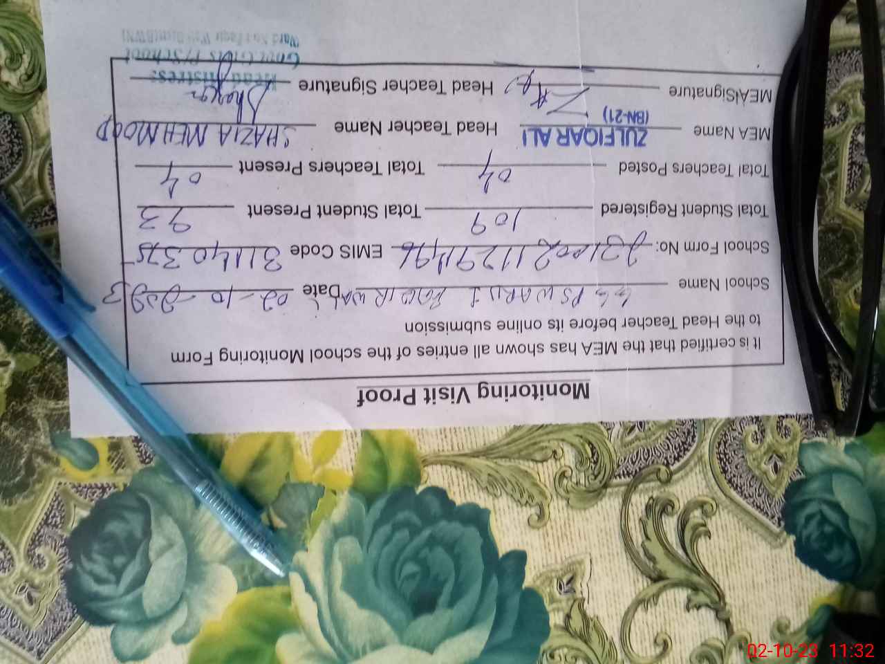 | Monitoring Date: 02-10-2023 | Start Time: 02-10-2023 11:19 AM | End Time: 02-10-2023 11:32 AM | Name of MEA: Zu**** Al**** BN**** | |