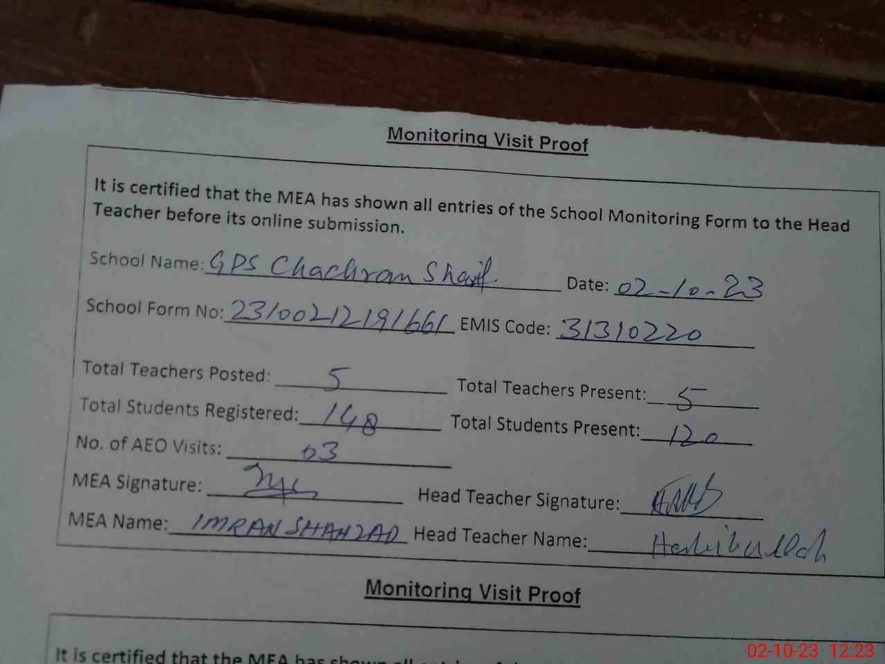 | Attendance Register | Head Teacher | MEA with School | Visit Proof |