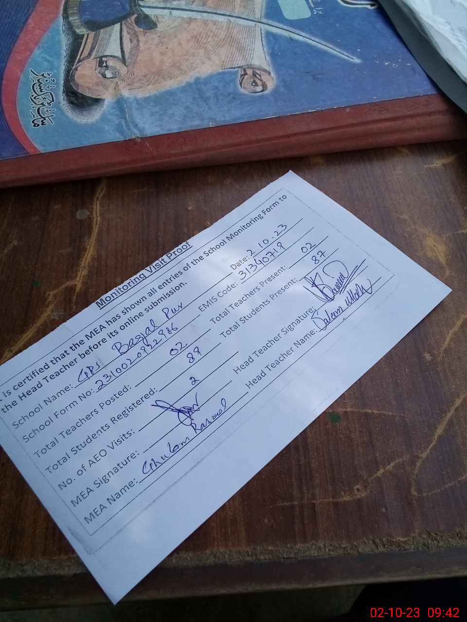 | Attendance Register | Head Teacher | MEA with School | Visit Proof |