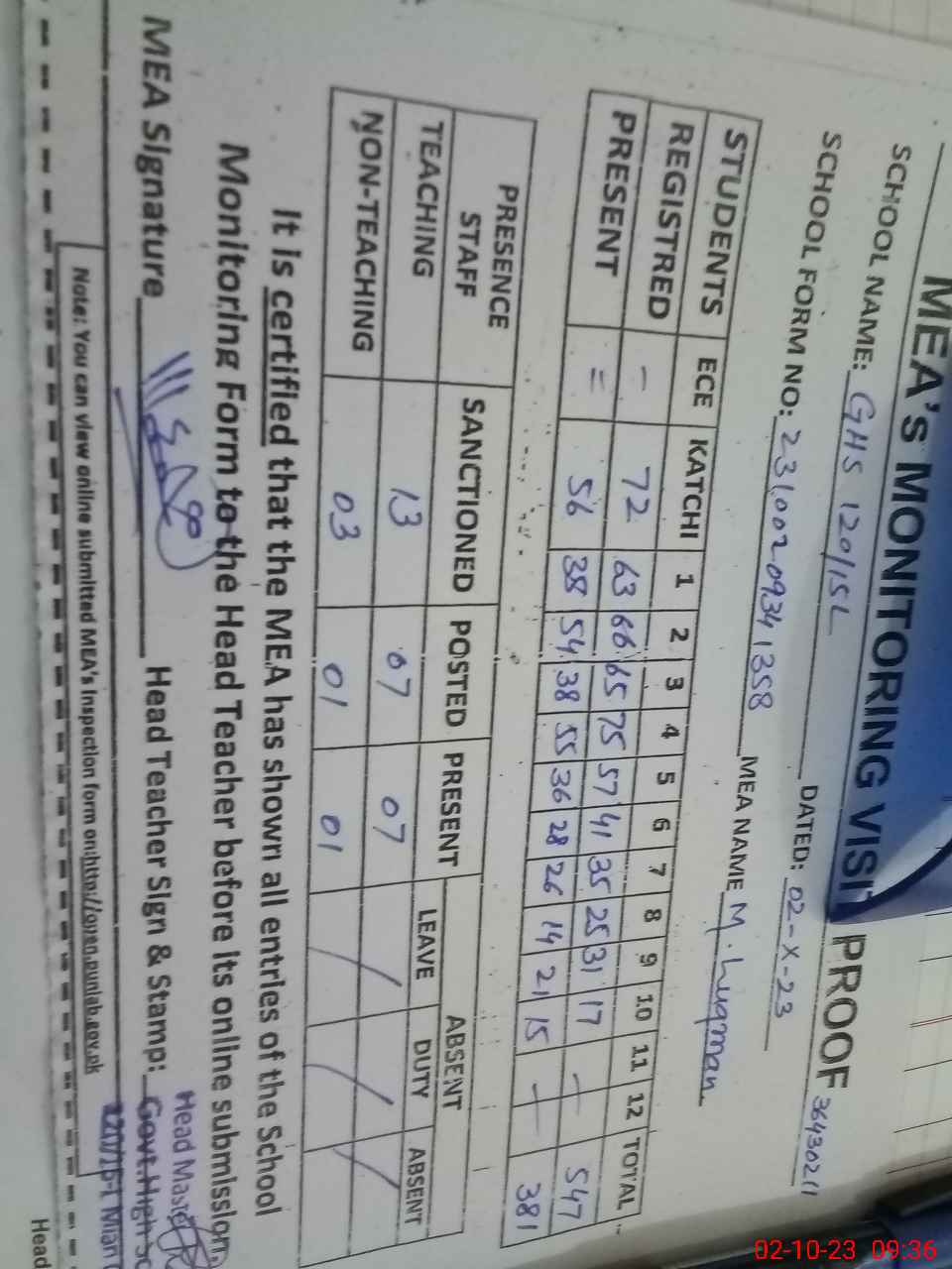 | EMIS Code: 36430211 | Name of School: GHS 120/15-L, MIAN CHANNU | |||