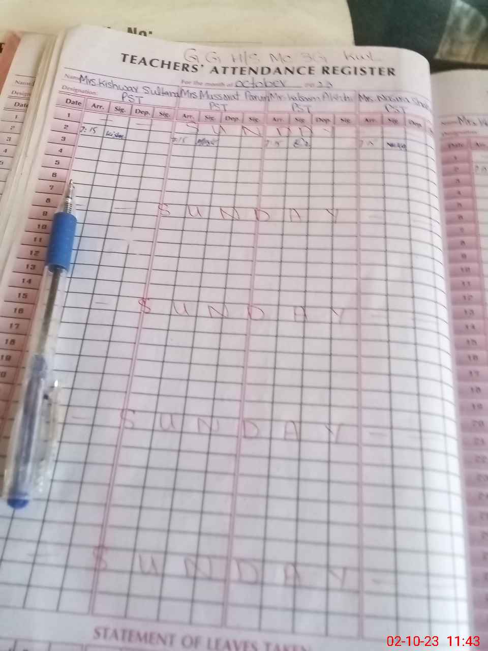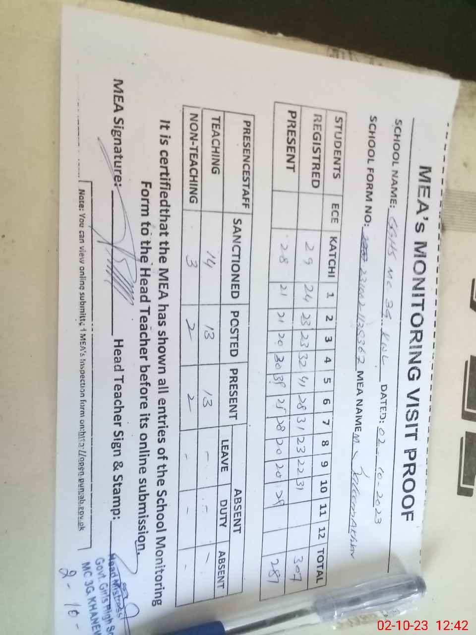 | Attendance Register | Head Teacher | MEA with School | Visit Proof |