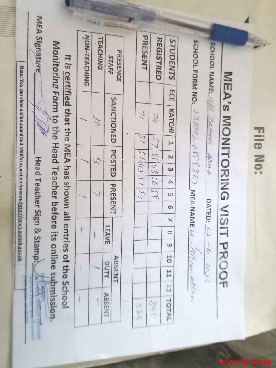 | Attendance Register | Head Teacher | MEA with School | Visit Proof |
