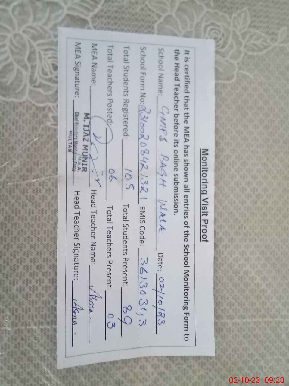 | Attendance Register | Head Teacher | MEA with School | Visit Proof |