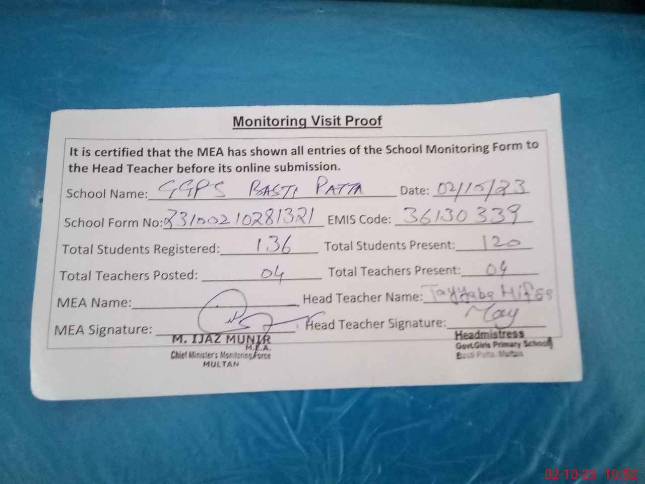 | Certified that this School was Inspected by the Undersigned MEA/DMO Today and the Information Stated Above is as Per Record. | |||||