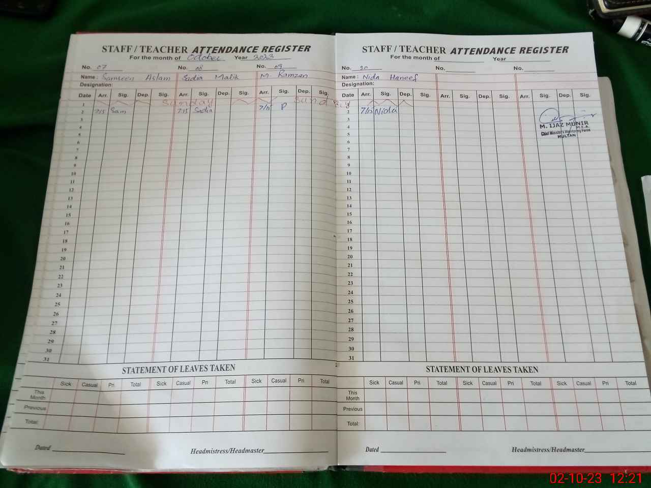 | CNIC | Full Name | Designation | R/C | Absence During Last Calender Month |