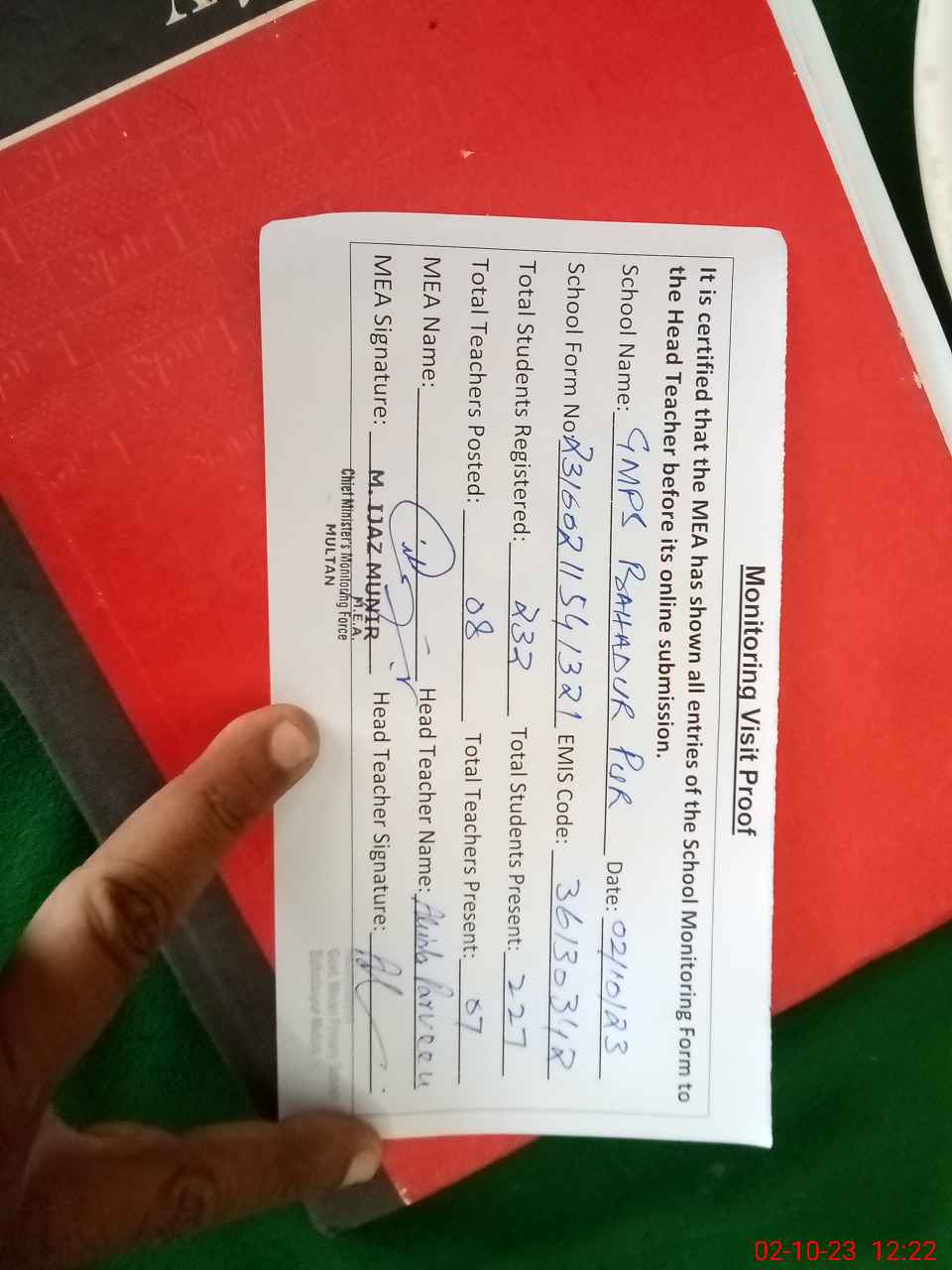 | Attendance Register | Head Teacher | MEA with School | Visit Proof |